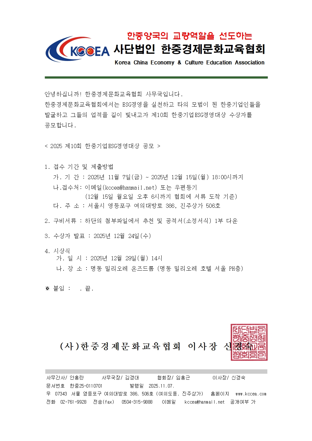 2025 ⌜제10회 한중기업ESG경영대상⌟ 수상자 공모