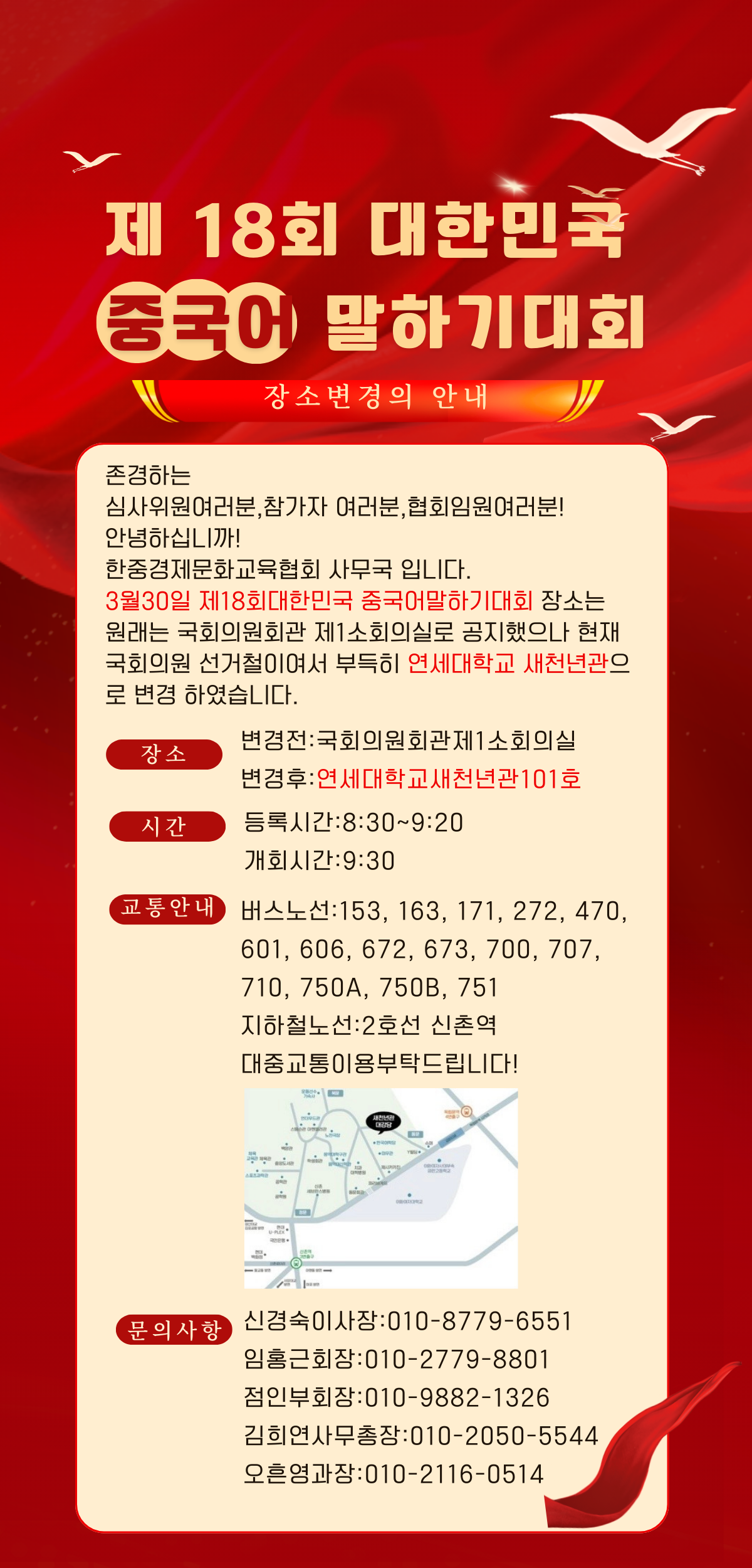 제18회 대한민국 중국어 말하기 대회 장소 변경 안내 및 행사 당일 등록 시간 안내